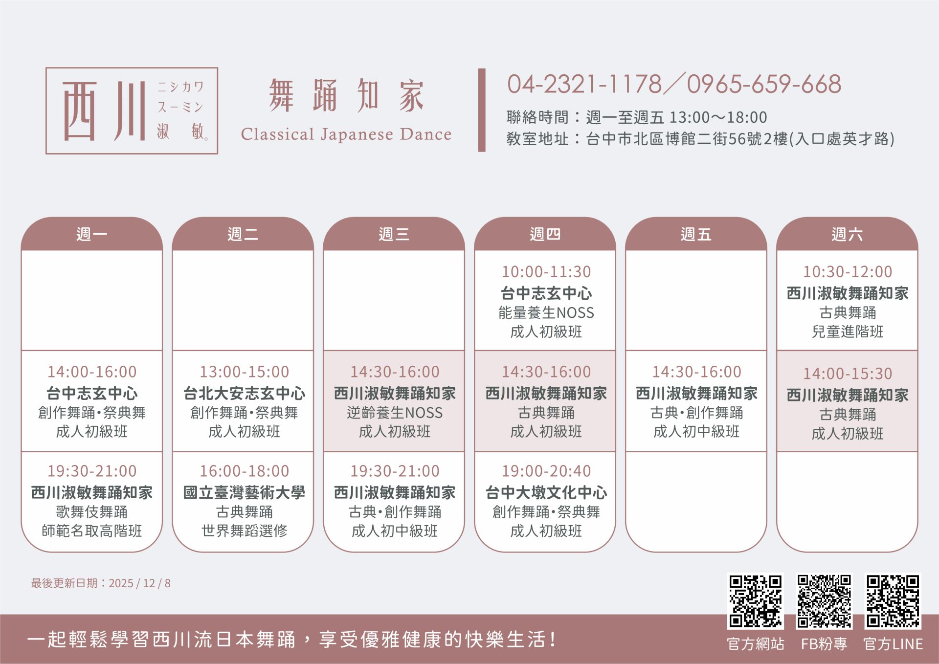 承襲自歷史最悠久的日本舞踊百年流派「西川流」,為台灣極少數能完整體驗日本舞踊的藝術研習場域。課程以古典舞踊為核心,結合美姿美儀與靜心放鬆,帶領學員在舞踊中培養氣質、舒展身心 ,邀您走進優雅、健康、快樂的生活藝術旅程。
